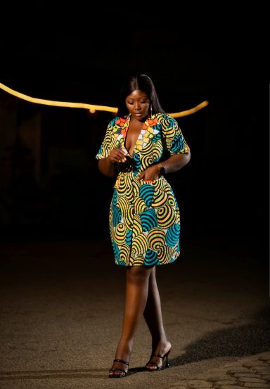 Élégante et moderne, la robe Sira sublime la silhouette avec sa coupe cintrée et son pagne wax coloré.